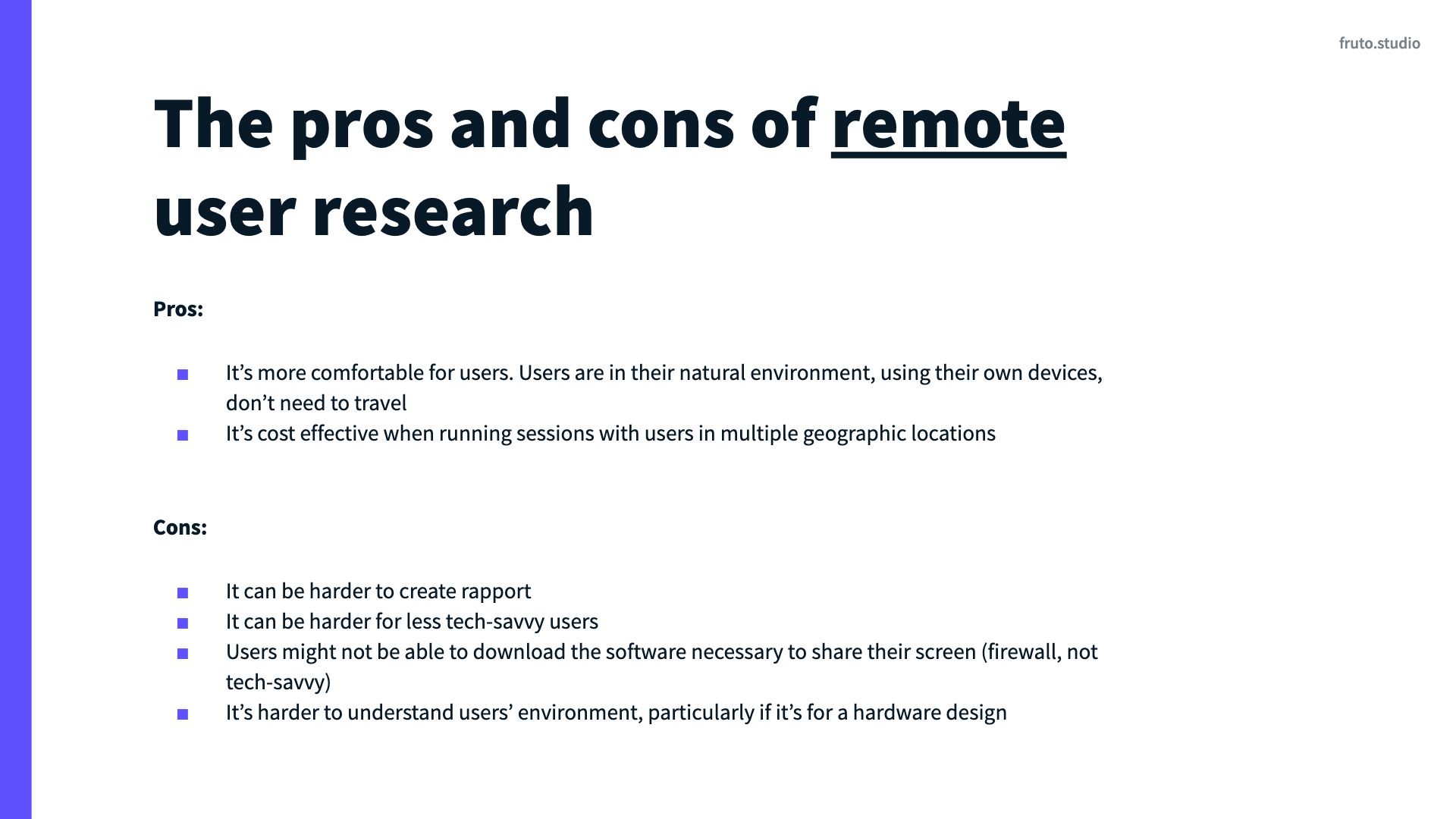 • The benefits of remote user research (particularly user interviews and usability tests)