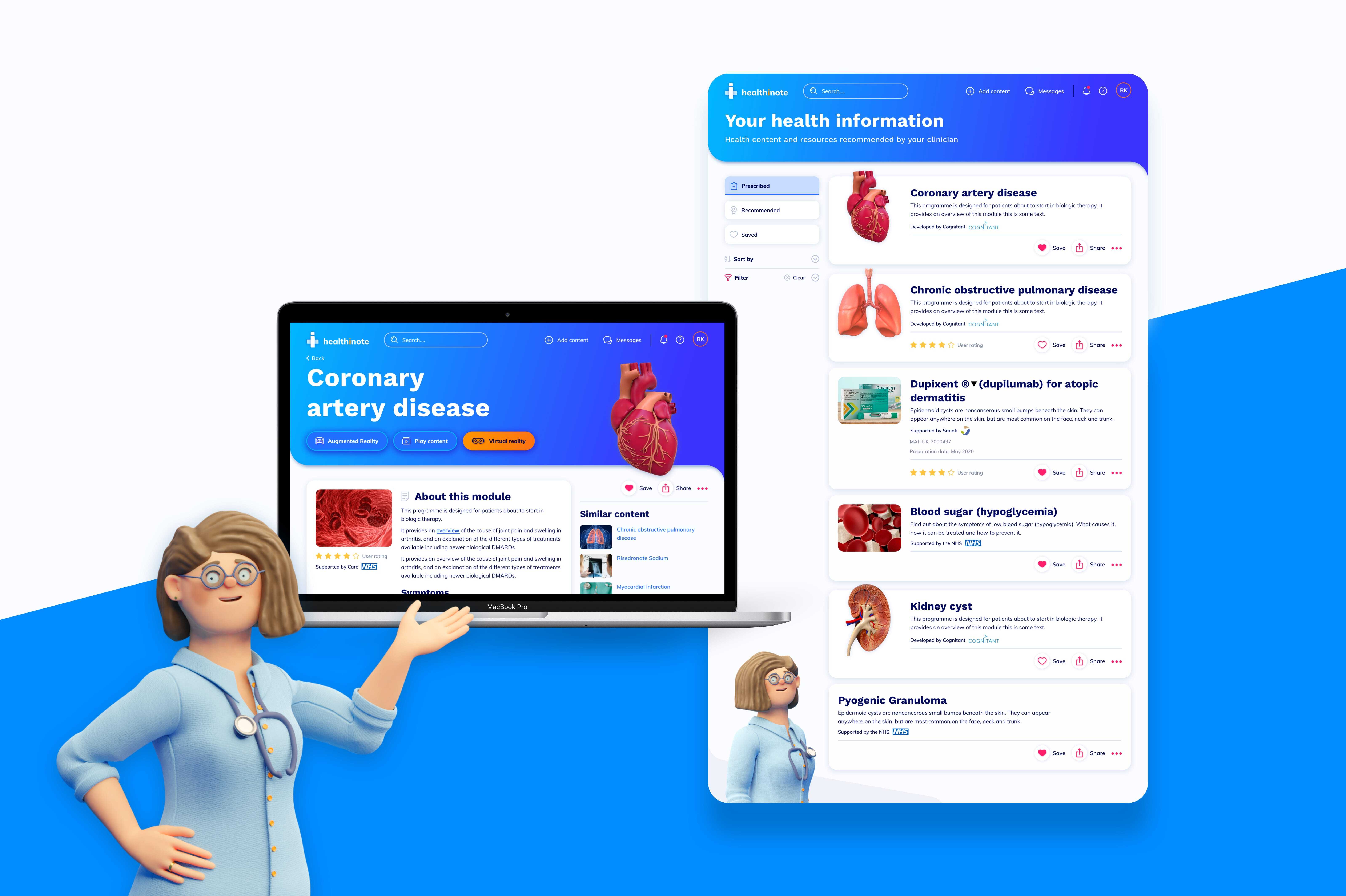 The Healthinote app contains a large volume of VR and video content, but existing user feedback from patients was that some of the content was overly clinical and actually put them off using the app. Likewise, as patients often experience anxiety when seeking health information, as part of the new UI design we also recommended a ‘3D character’ to help provide a more reassuring, productive and positive experience.