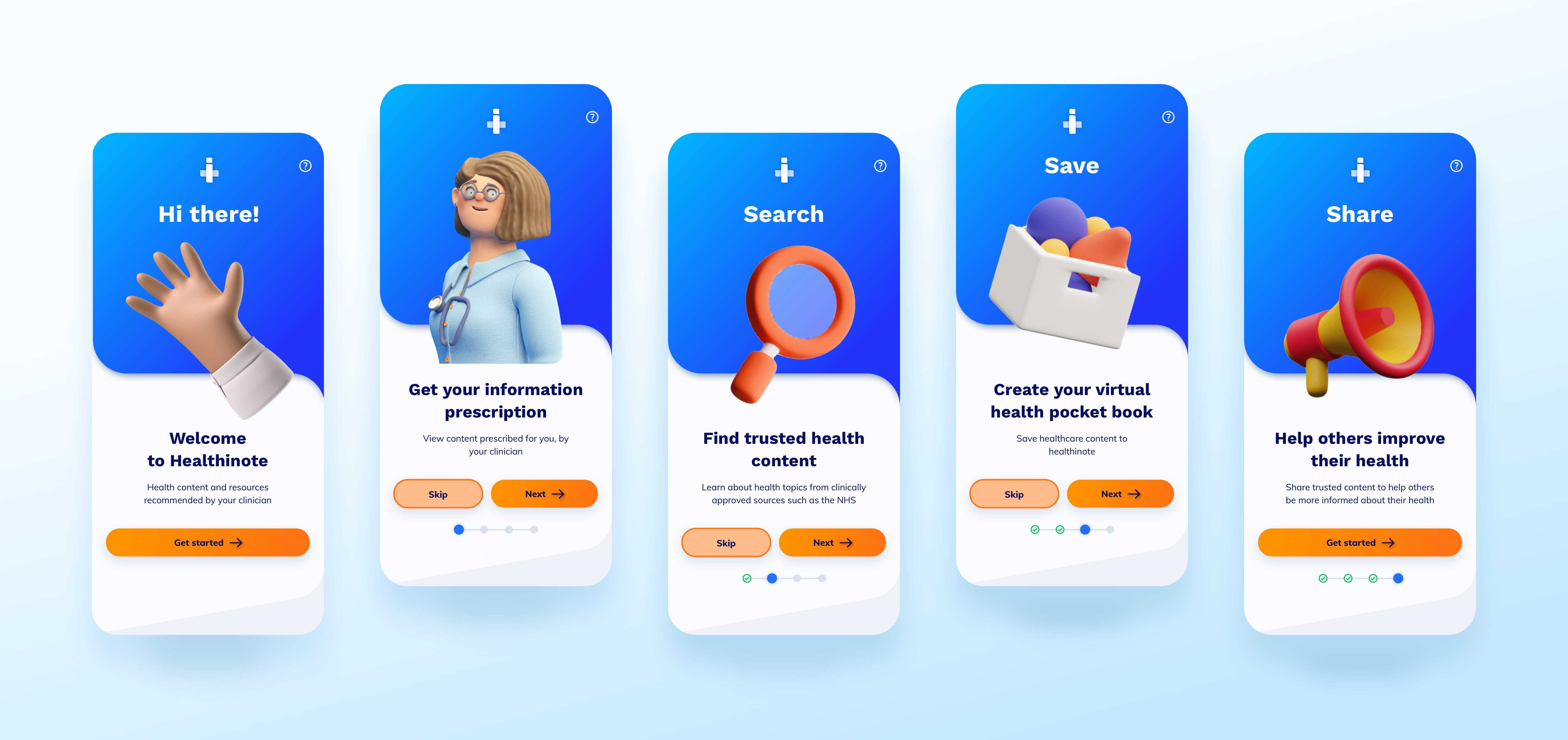 As there were a number of scenarios through which a new user may wish to get started with the Healthinote app (e.g. referral from a GP, recommendation, personal AppStore search), we also and created a number of onboarding screens that would help users find their way around the app when they first started using it - aligned to whatever their starting point with the app was.